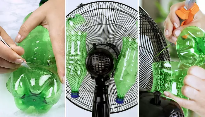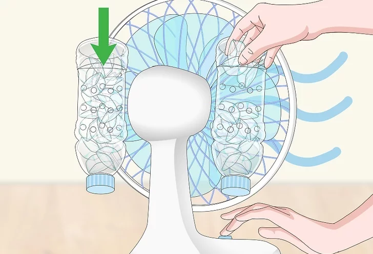 Buzları şişenin içine koyabilmek için şişenin altındaki kesiklerin ağızlarını açın. Şişeyi deliklerin altına kadar doldurun. Vantilatörü yüksek hıza ayarlayın ve soğutmak istediğiniz alana çevirin. Vantilatör, şişelerdeki soğuk havayı açtığınız deliklerden çekecektir. Şişeler vantilatöre bağlı olduğundan, vantilatörünün salınım özelliğini kullanabilirsiniz.