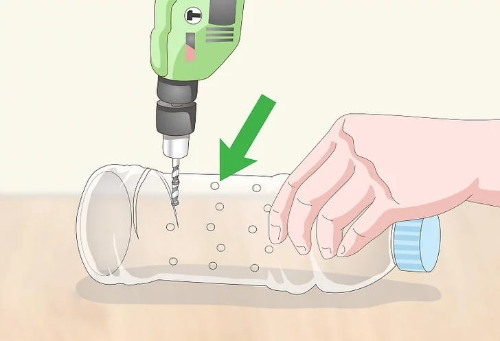 Kesiğin üst kısmına yarım santim aralıklarla delikler açın. Plastik için 6 milimetrelik matkap ucu kullanın. Kesiğin 1 cm yukarısından başlayarak şişenin etrafına sıra sıra delikler açın. İlk sırayı bitirdikten sonra onun üstüne 2-3 sıra daha yarım santim aralıklı delikler açmaya devam edin.
